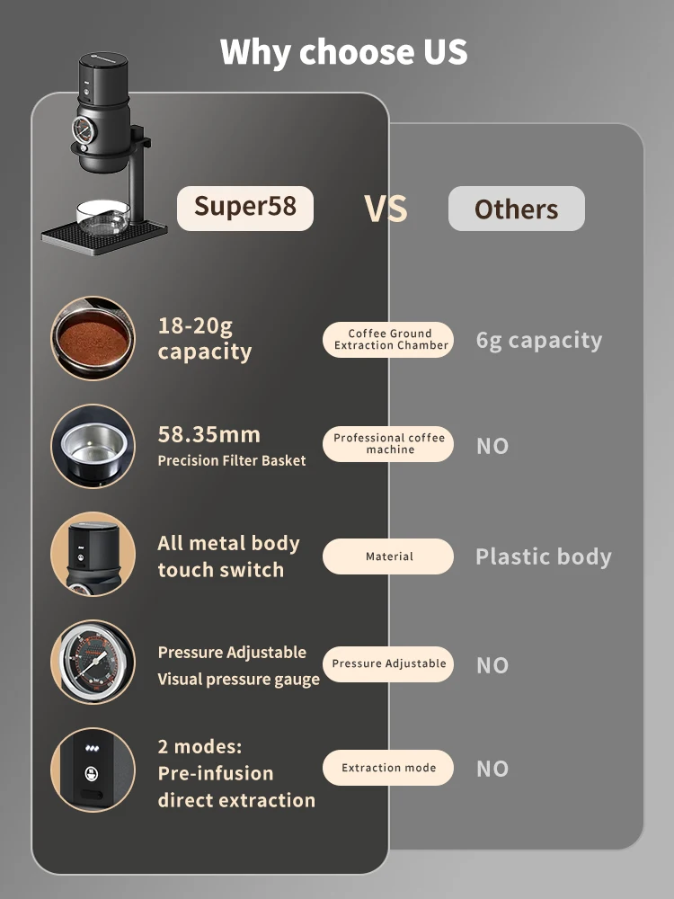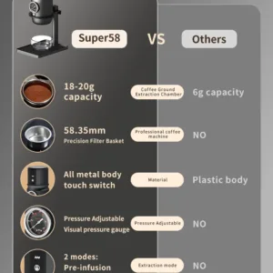 *All-metal body: Super58 espresso machine is made of aluminum alloy, fully equipped with USB-C, stand, metering funnel, coffee tamper, silicone insulation sleeve and carrying bag, convenient for carrying out.